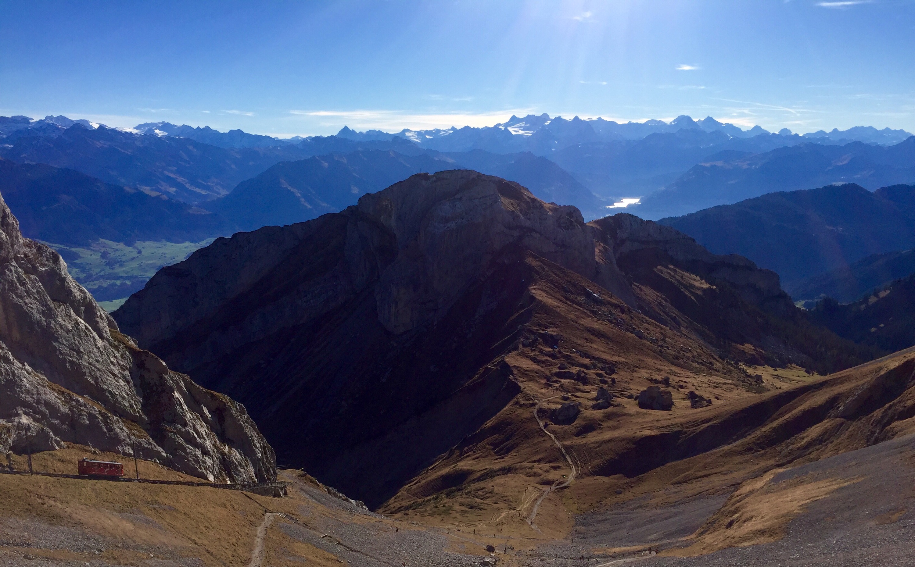 - Please please please DO. NOT. TAKE the cogwheel train right away otherwise you will miss a fantastic trail! You could spot some mountain goats! The trail down to Alpnachstadt is steep and rocky so make sure you only go down that way if you have proper hiking boots, I would NOT recommend sneakers on that trail.